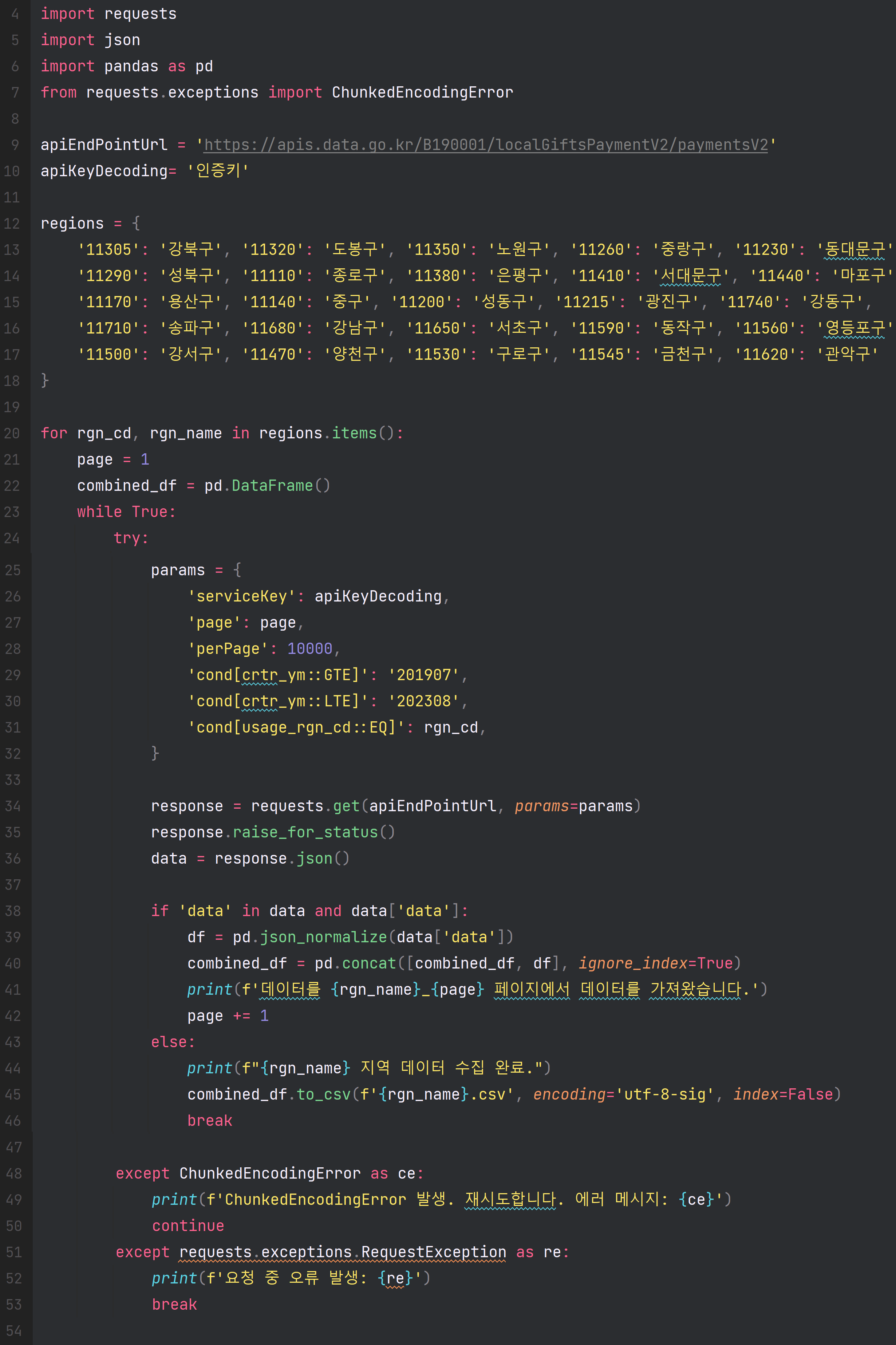 - 구별로 1만개씩 끊어 응답하는 데이터를 이어붙여 하나의 파일로 저장.