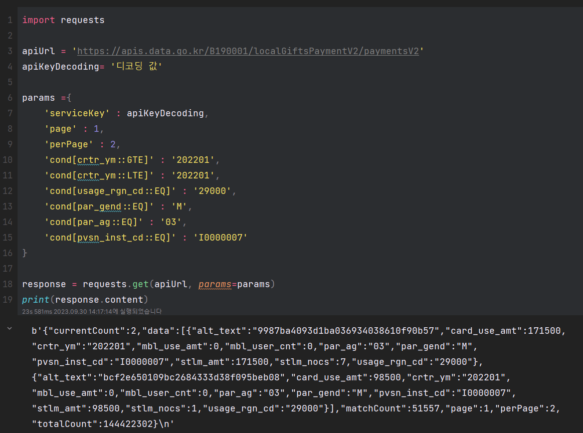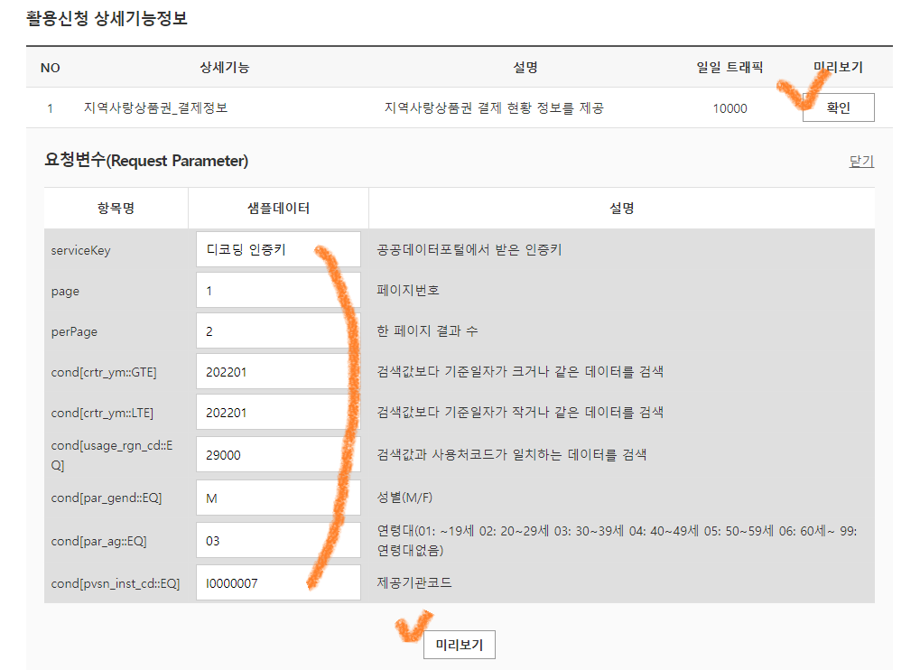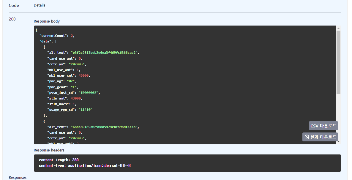 1. '한국조폐공사 지역사랑상품권 결제정보' 오픈 API는 샘플코드가 없어 다른 데이터의 샘플코드 카피
