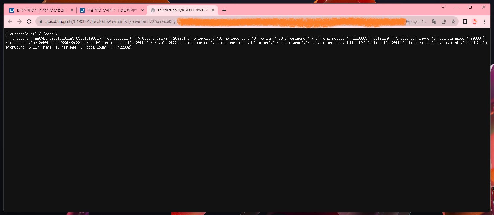 - 나머지 필수값에는 작은 값을 넣어 테스트해보자 (여기서는 다음 값을 넣었다. 페이지번호: 1, 한 페이지 결과 수: 2 )