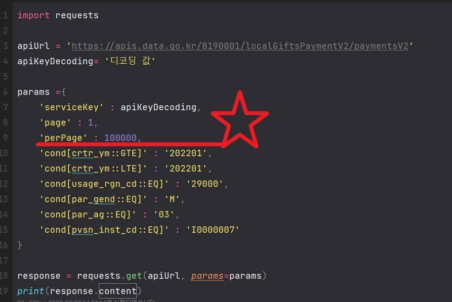 2. 코드를 보면 'url', '서비스키', 'params' 정보가 필요