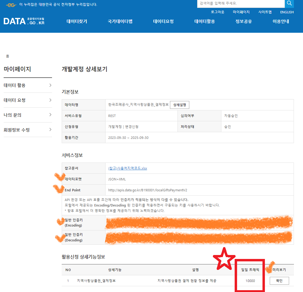- 주의. '마이페이지'의 '개발개정 상세보기'에서 확인한 End Point 주소를 API의 url로 사용하면 안됨(이유는 밑에서).