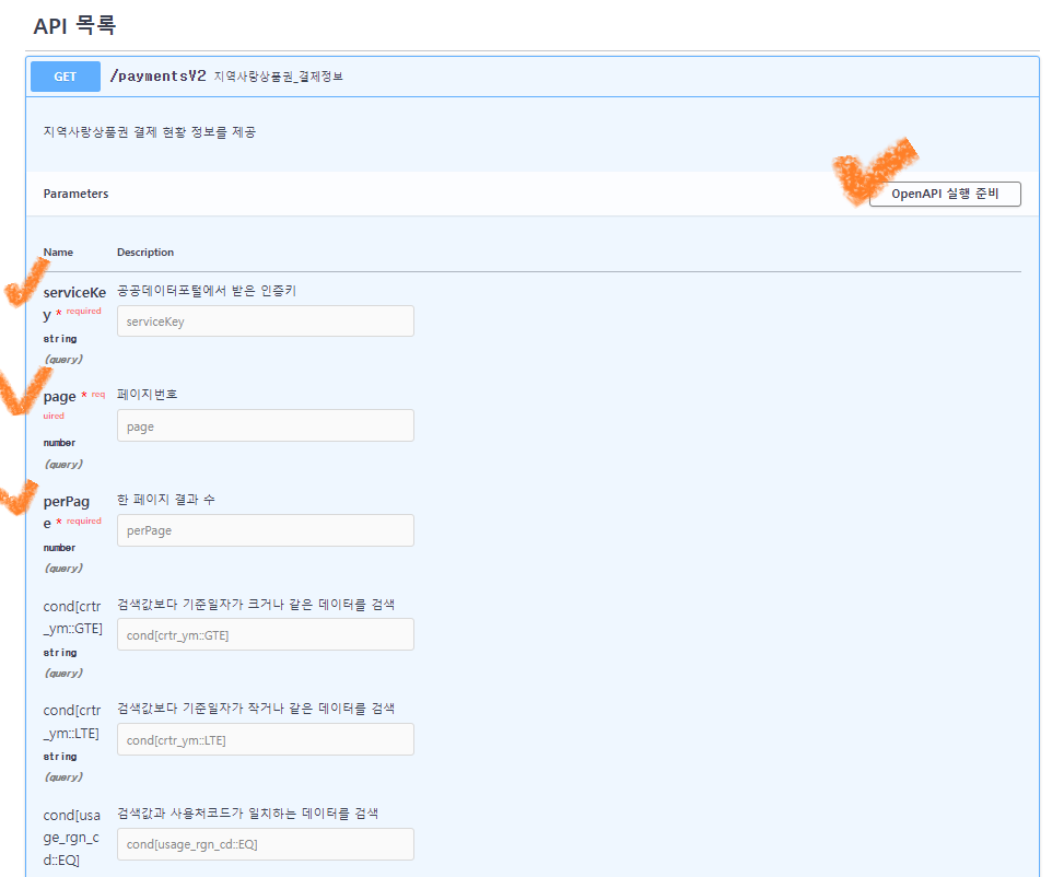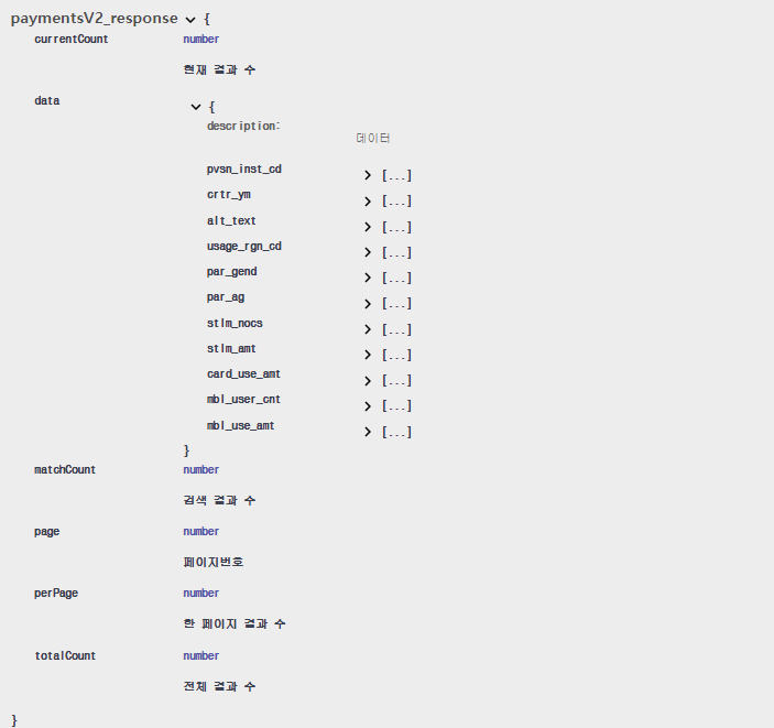 (API 목록의 ' GET /paymentV2 지역사랑상품권_결제정보' 클릭 드롭다운으로 창이 확장했을 때 확인한 Parameters의 Name 들)