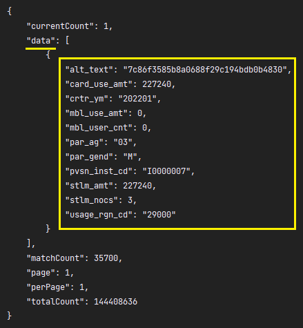 - API 마다 컬럼이나 데이터 구조 정리를 다르게 했을 수 있으니 선택한 API가 제공한 대로 확인한다.