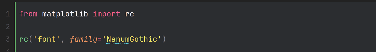 1번째 라인 : 'matplotlib' 라이브러리에서 폰트관리 모듈인 'rc' 모듈을 가져온다 (Runtime Configuration)