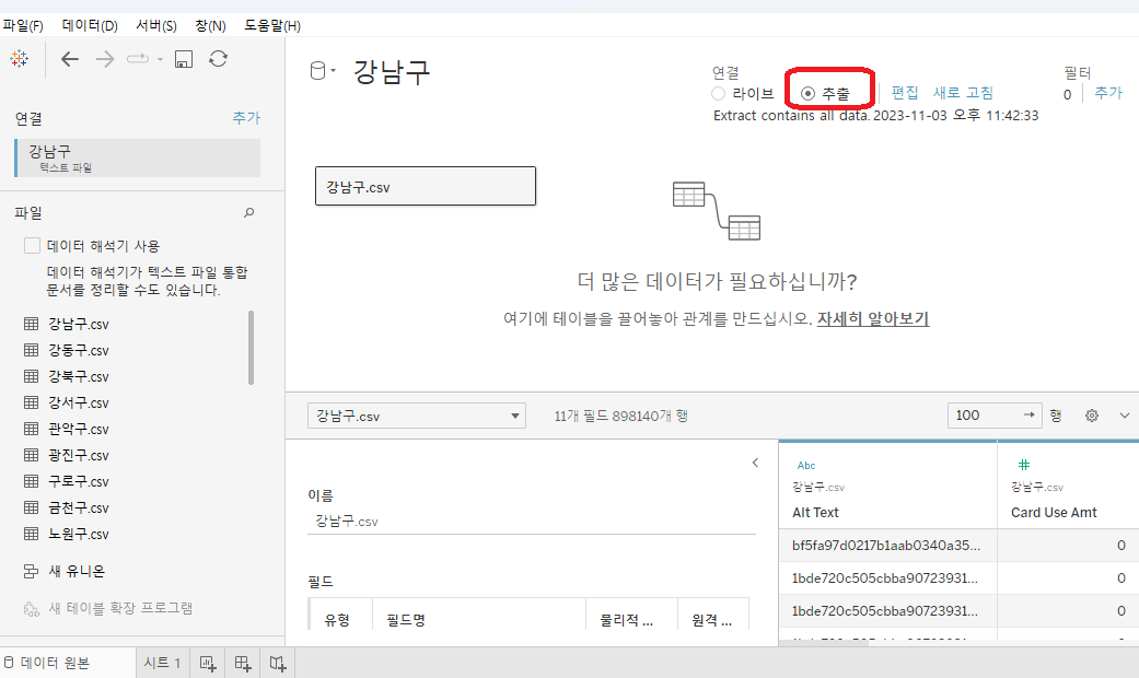 - 우측 상단 연결아래 라디오버튼 중 '추출' 선택
