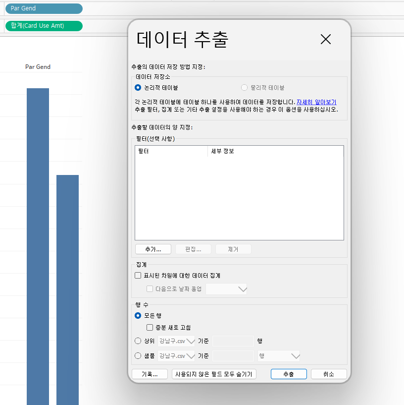 - 최상단 툴바 중 '데이터' - '테이블명' - '데이터 추출'