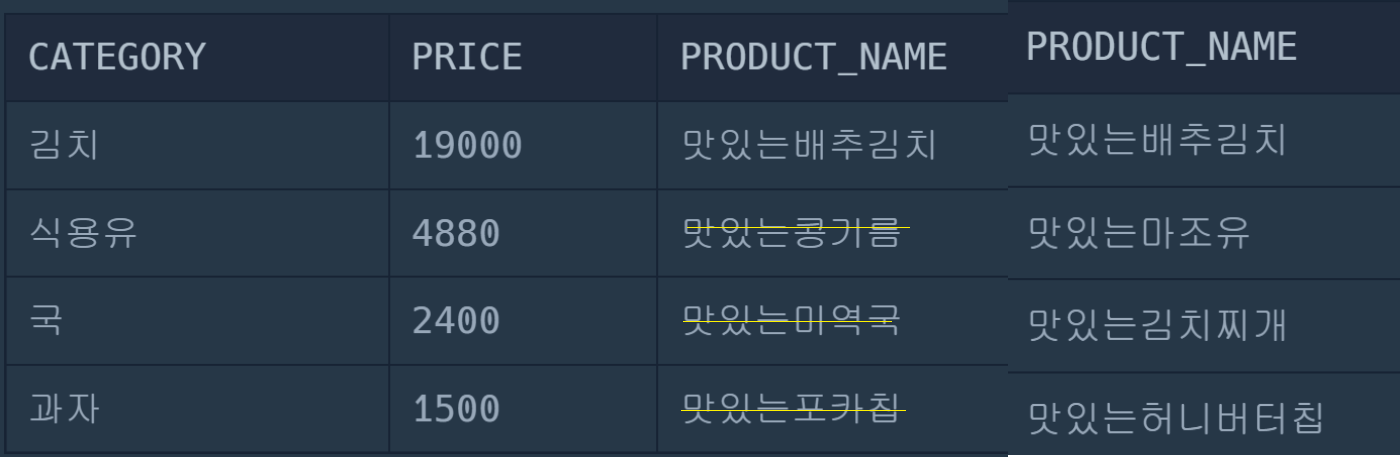 필터링된 결과에서 CATEGORY, PRICE, PRODUCT_NAME 컬럼을 선택합니다.