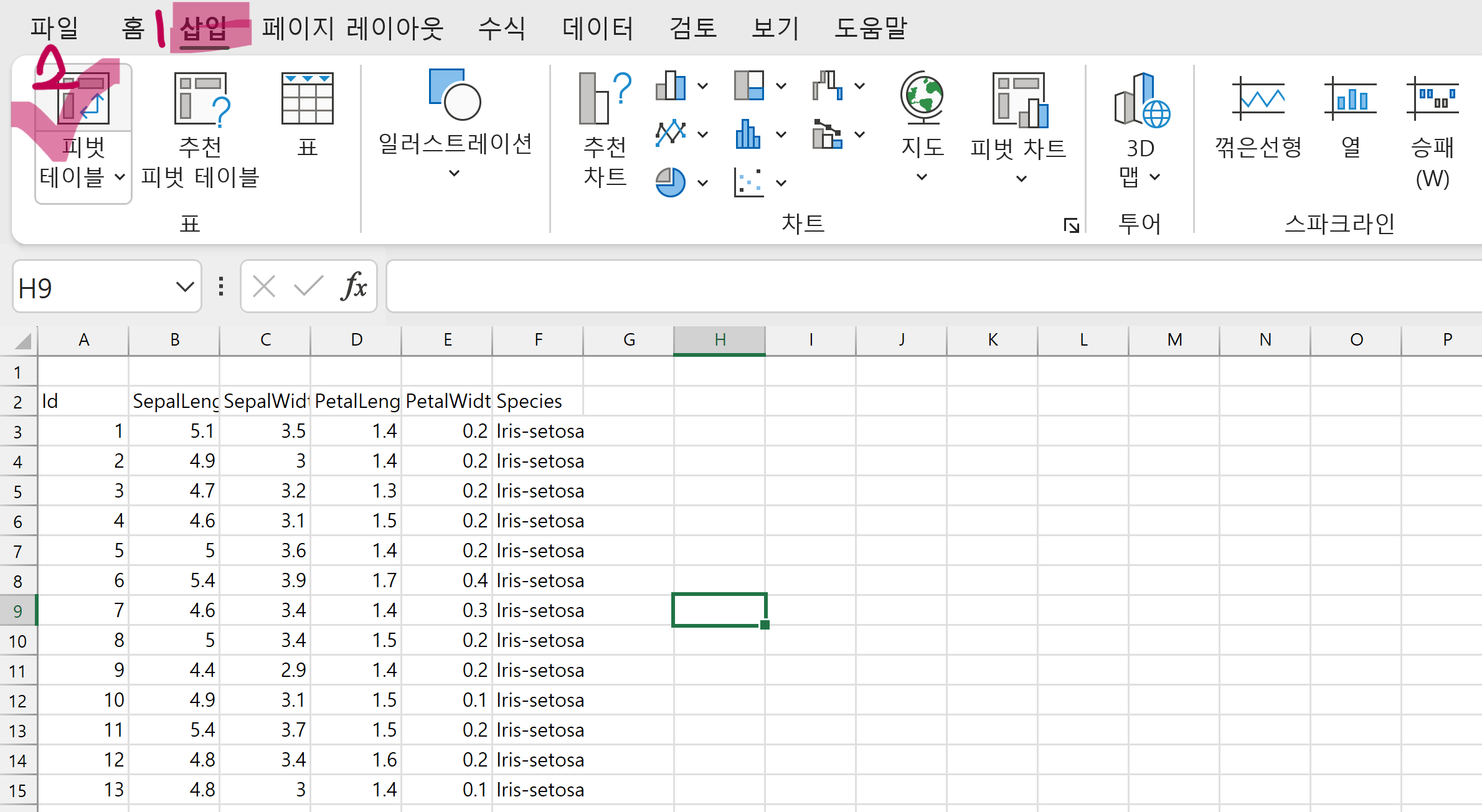 1. 최상단 리본도구 위에 [ 파일 - 홈- 삽입 - 그리기 ] 중 '삽입' 선택
