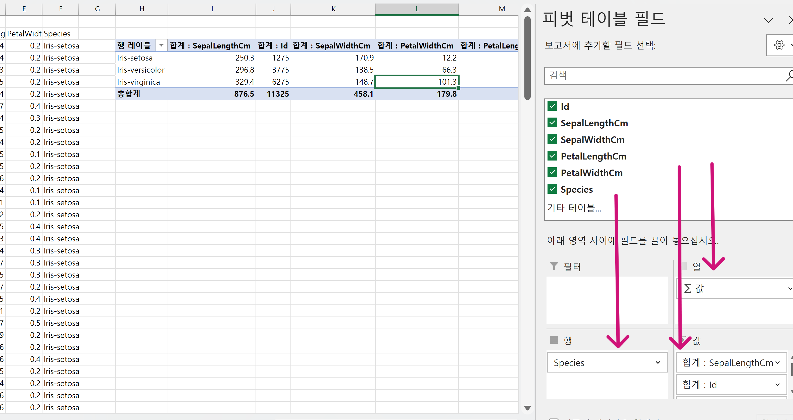 피벗 테이블 필드가 뜨면 검색 아래의 사항들을 클릭하거나4분할 되어있는 곳으로 드레그해 원하는