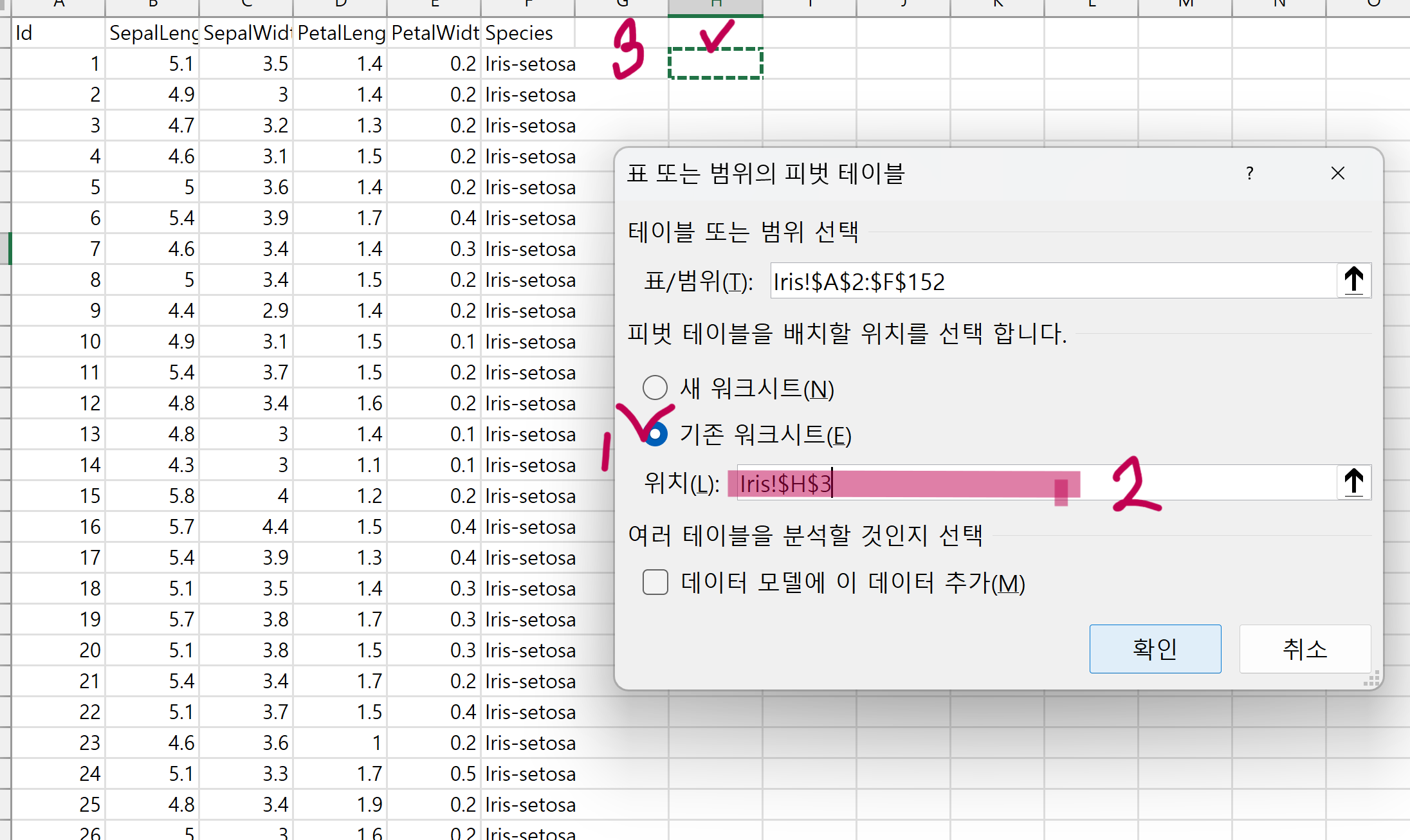 3. 테이블 생성 위치 선택 팝업창의 최하단에 확인