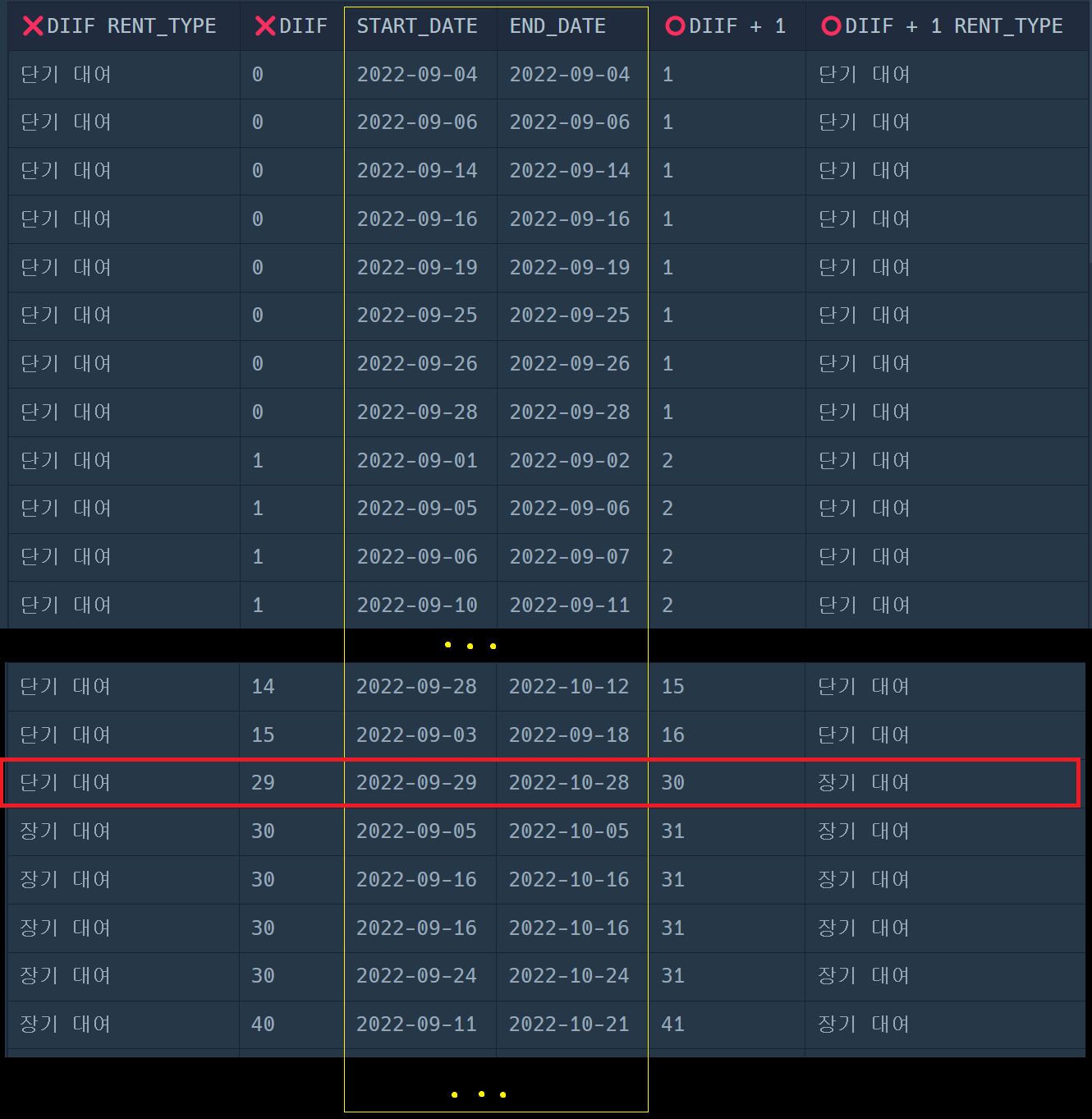 - 아래 이미지를 보면 중간의 START_DATE, END_DATE의 양쪽으로 두가지 경우의 출력 결과를 확인할 수 있다. 좌측은 그냥 "날짜 차이 함수"를 썼을 때의 결과, 우측은 "날짜 차이 함수 + 빌린날 하루를 더한" 결과이다. 문제의 조건에서 날짜차이를 조회하지는 않지만 빨간색 상자 부분에서 RENT_TYPE이 달라지기 때문에 오답 처리된다.
