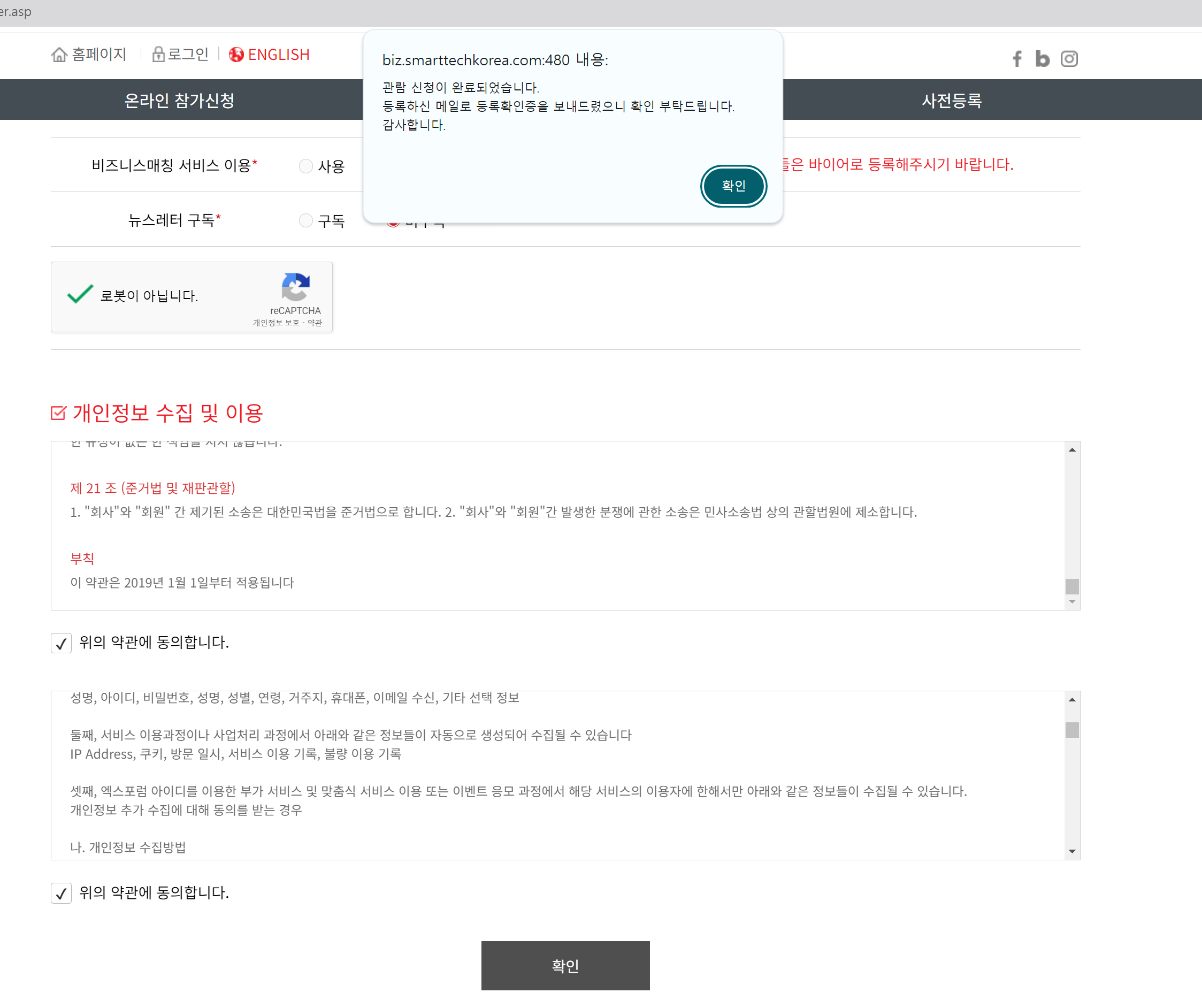 팝업창으로 등록 확인증을 보냈다는 메시지를 확인할 수 있었지만,