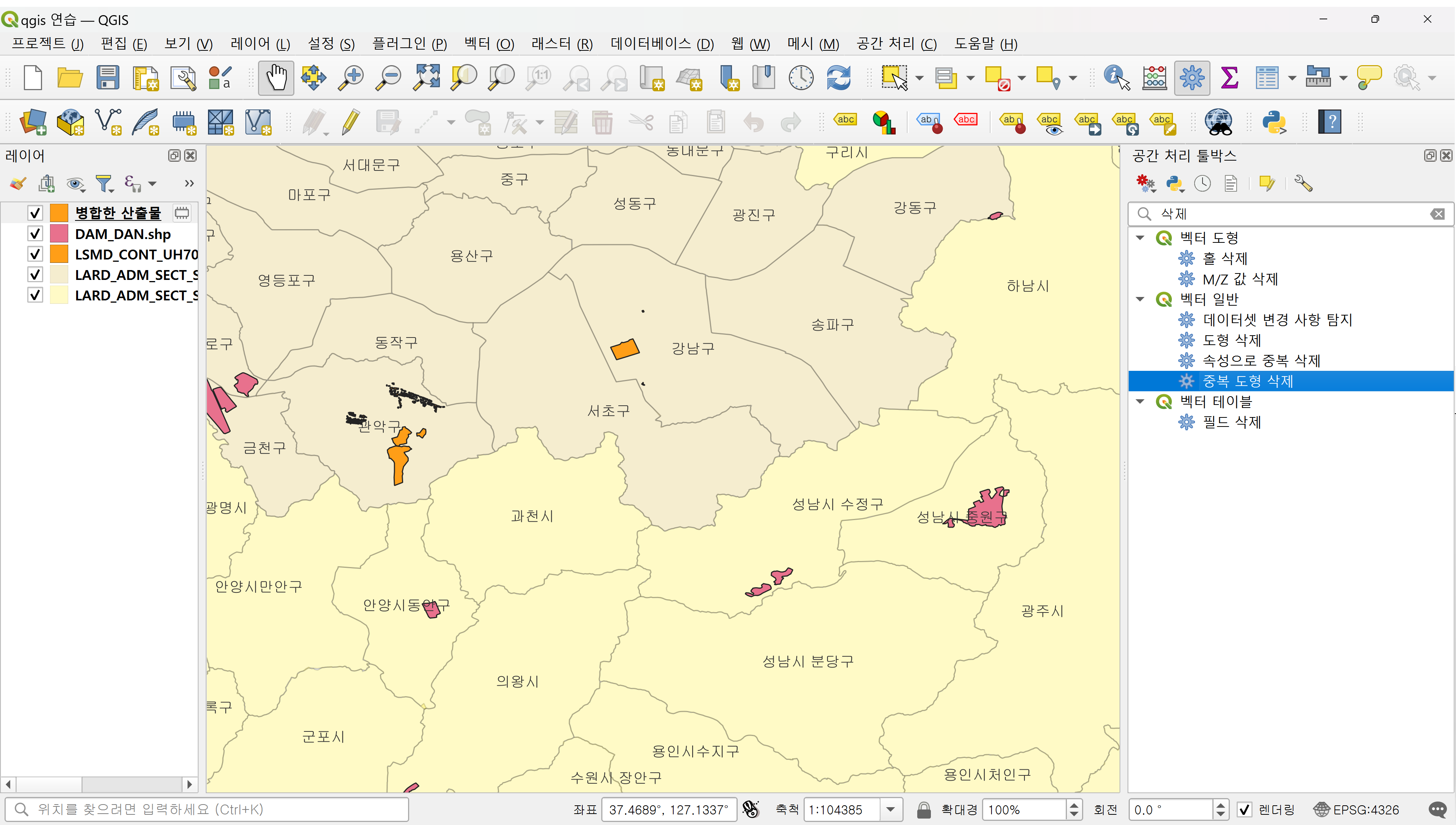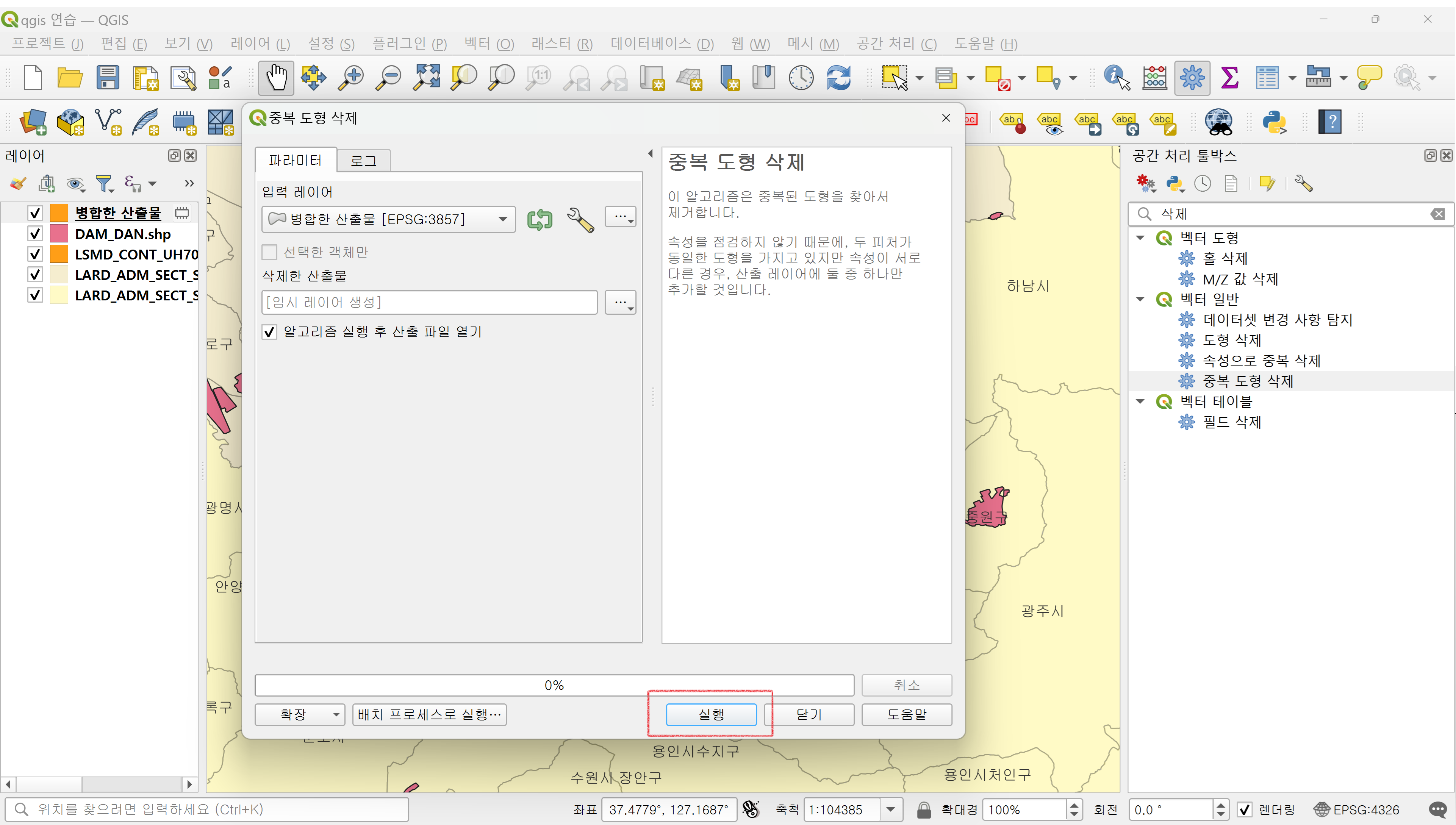 1. 공간 처리 툴박스 > 검색에 '삭제' 텍스트 입력 > '중복 도형 삭제' 선택.
