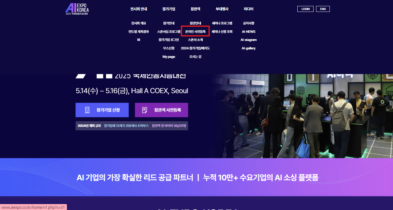 최상단 네비게이션 바에 커서를 올려 메뉴를 드롭다운 - '온라인 사전등록' 클릭