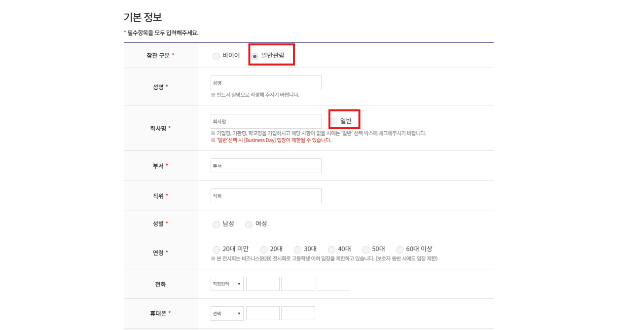 일반관람 선택 - 회사명 (또는 회사명 미기재 시 일반 버튼 선택)