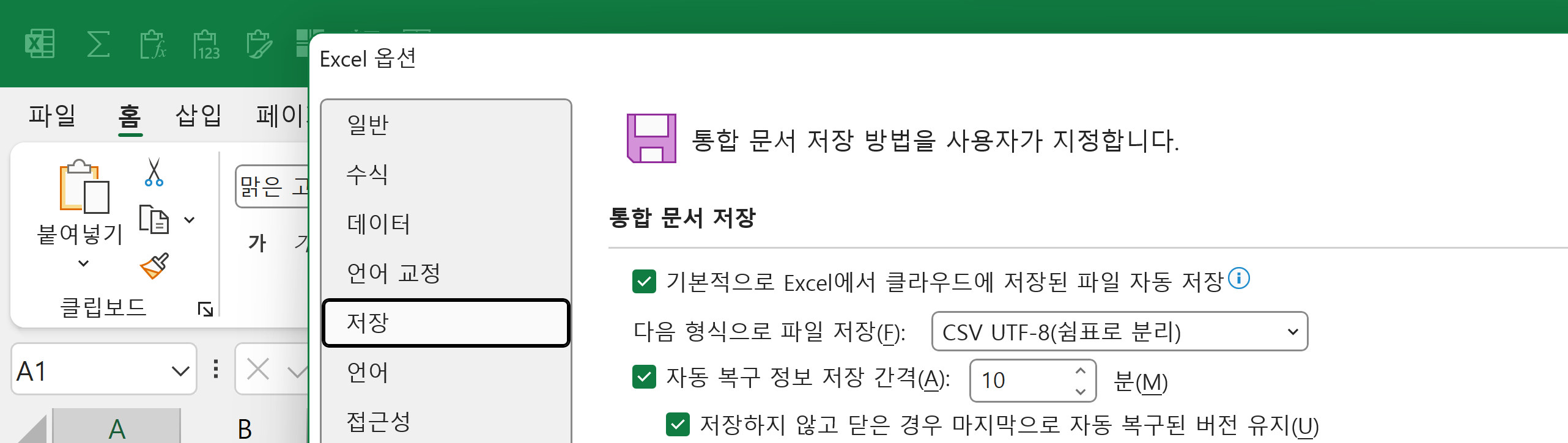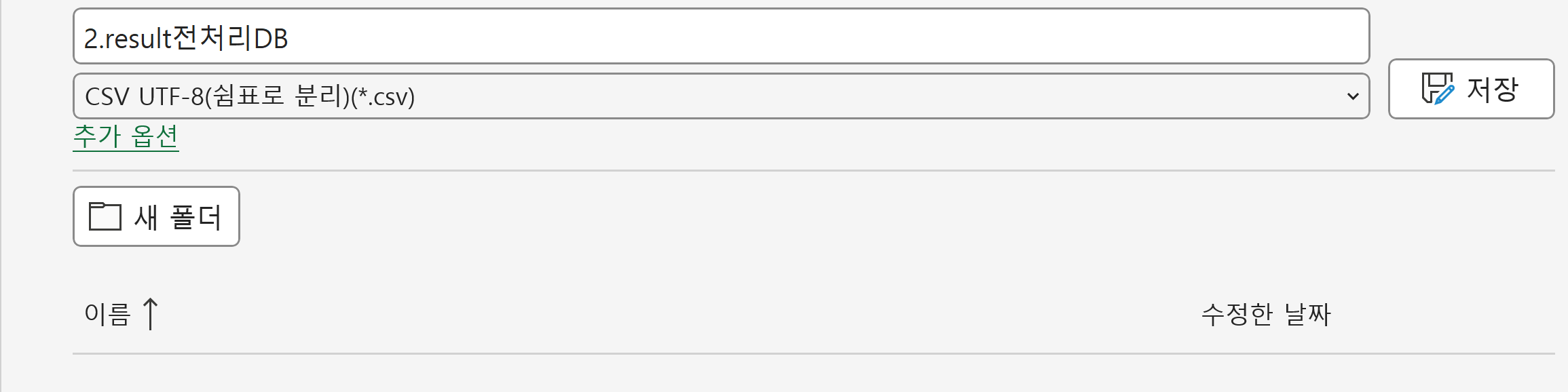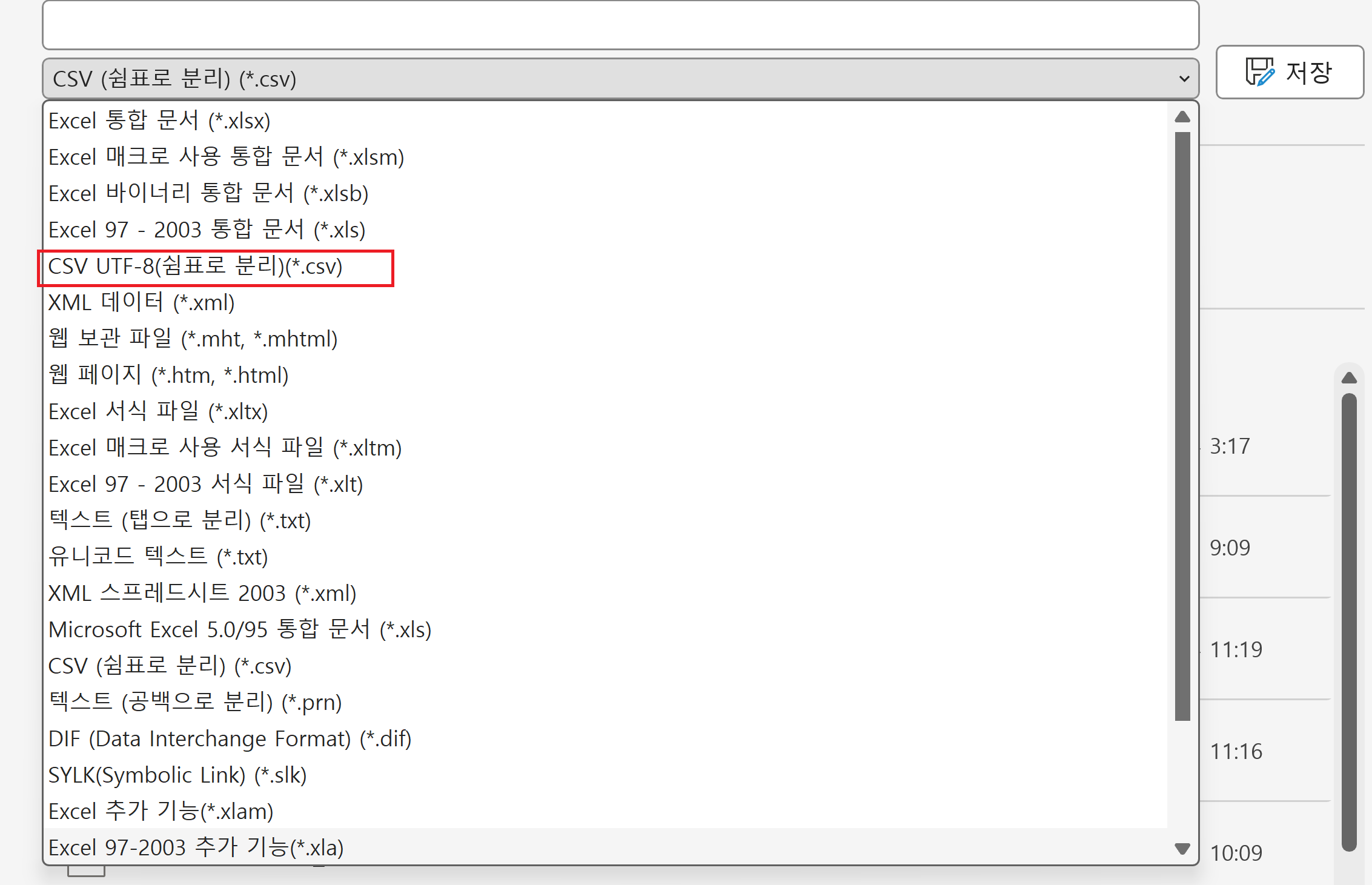 3. 확장자 드롭다운을 내려 CSV UTF-8(쉼표분리)(*csv) 로 선택 후 저장 (저장이 안된다면 저장 위치를 바꿔보자)